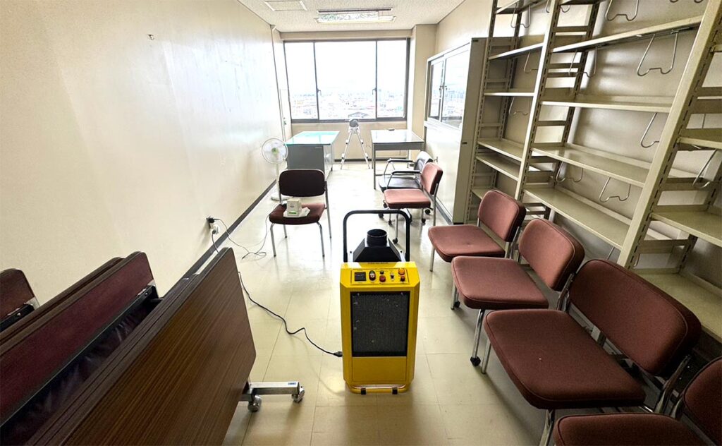 室内が広いため、大型オゾン発生器を使用。さらに、オゾンが室内全体へ循環するよう送風ファンを設置しました。